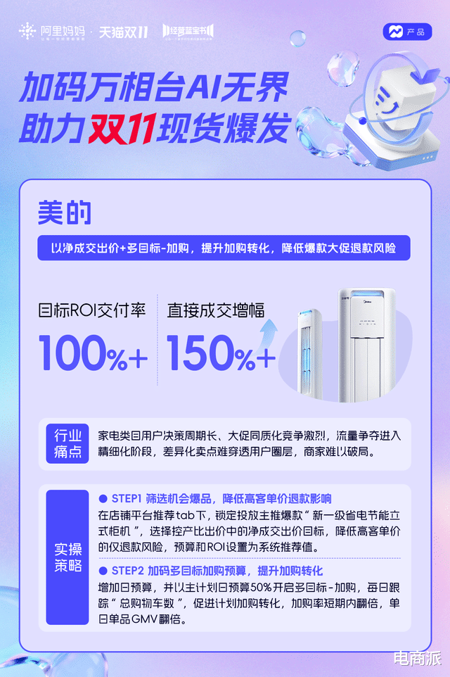 像是美的就通过AI智能选品,快速从全店货品中识别并锁定潜力爆款,并采用系统推荐ROI进行出价,最终成交增幅高达150%。