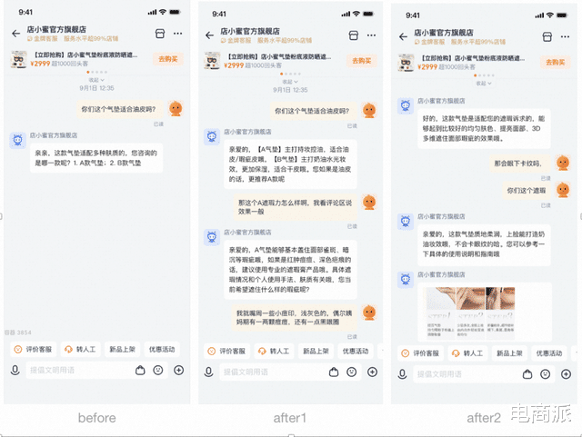 相比以前只会按照知识库里配置好的QA回答用户问题,店小蜜5.0实现了从“被动应答”到“主动服务”的重大升级。比如当用户询问“你们这个气垫适合油皮吗?”,以前的智能客服需要根据预设的配置,一步步提问用户,才能准确定位到知识库里的具体段落进行回答;而如今的则可以直接展示不同SKU的区别,并进一步理解用户意图、做出精准推荐。