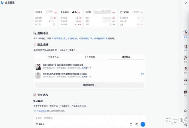 同样的,除了经营环节生意管家提供的AI数字员工以外,商家做营销推广时,AI的诊断分析也同样重要。