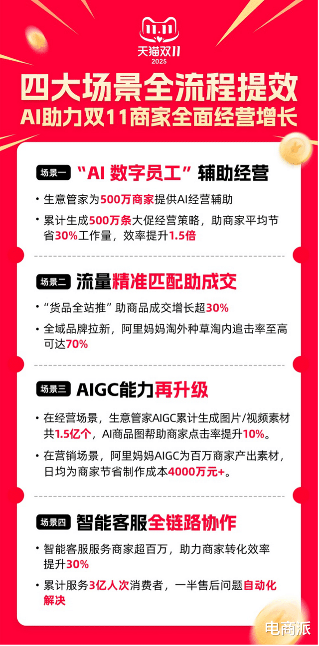今年以来,淘宝天猫持续推进AI技术在电商经营全链路的深度应用。尤其是在天猫双11期间,围绕AI数据分析、AI营销、AI美工和AI客服等核心场景,淘宝通过一系列智能产品的迭代升级,为商家提供切实“好用”的AI工具,带来全面经营帮助。